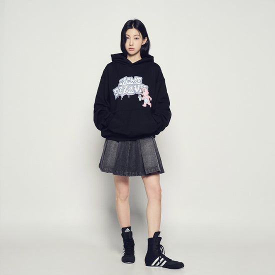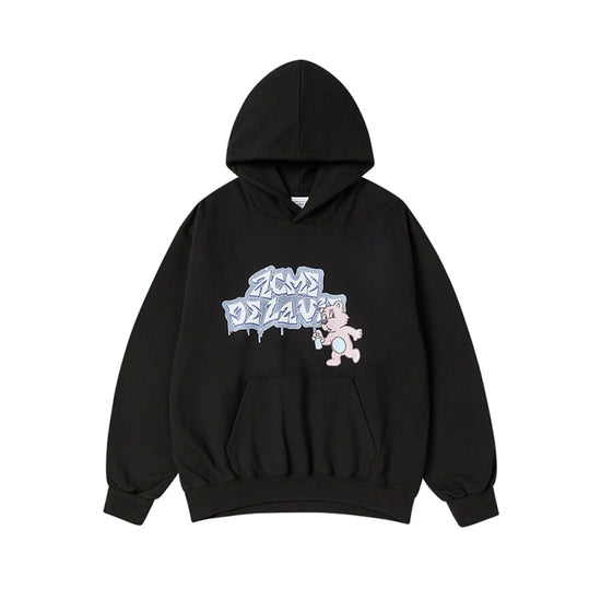 A bold black hoodie featuring ADLV’s playful spray-paint bear graphic, blending street art aesthetics with cozy everyday comfort.