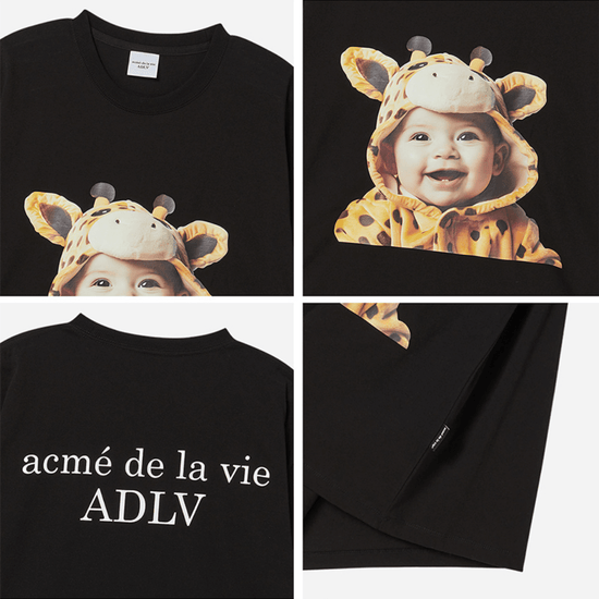 A playful and distinctive graphic tee from ADLV’s Baby Face series that brings a touch of humor and warmth to modern streetwear. The Baby Face Giraffe Baby Short Sleeve T-shirt in black showcases a charming baby portrait wearing a giraffe costume, printed in high resolution for standout visual appeal. The back of the shirt features the “acmé de la vie ADLV” logo, completing the signature look. Crafted from 100% premium cotton, this tee delivers softness, breathability, and a structured oversized fit that ensures comfort and street-ready style.