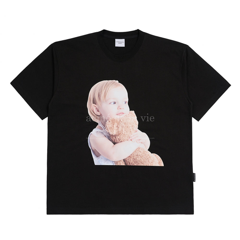 BABY FACE PEARL NECKLACE GIRL SHORT SLEEVE T-SHIRT BLACK