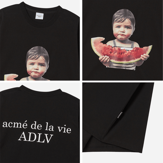 A playful and bold statement piece from ADLV’s signature Baby Face collection. The Baby Face Watermelon Girl Short Sleeve T-shirt in black features a high-resolution graphic of a baby girl holding a slice of watermelon, blending humor with streetwear artistry. The back showcases the “acmé de la vie ADLV” logo print for brand balance. Made from 100% premium cotton, this shirt offers superior softness, breathability, and structure for lasting comfort and style.
