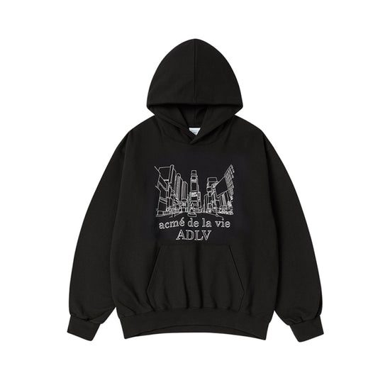 A bold black hoodie featuring a detailed city skyline graphic across the chest. Made from 100% premium cotton, this hoodie offers a soft, warm feel and a relaxed fit—ideal for layering and everyday streetwear styling.