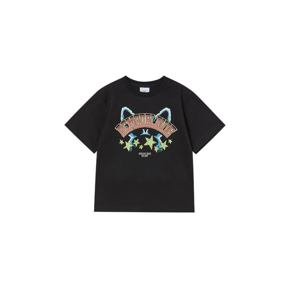 A lively and colorful black kids’ tee featuring ADLV’s star-themed rabbit graphic, blending playful character art with a bold streetwear-inspired look.