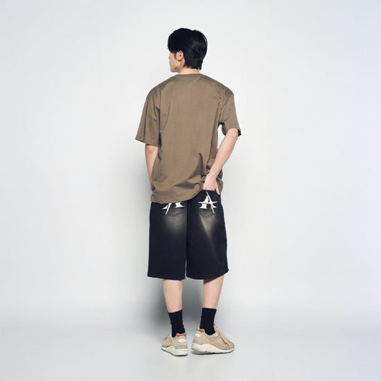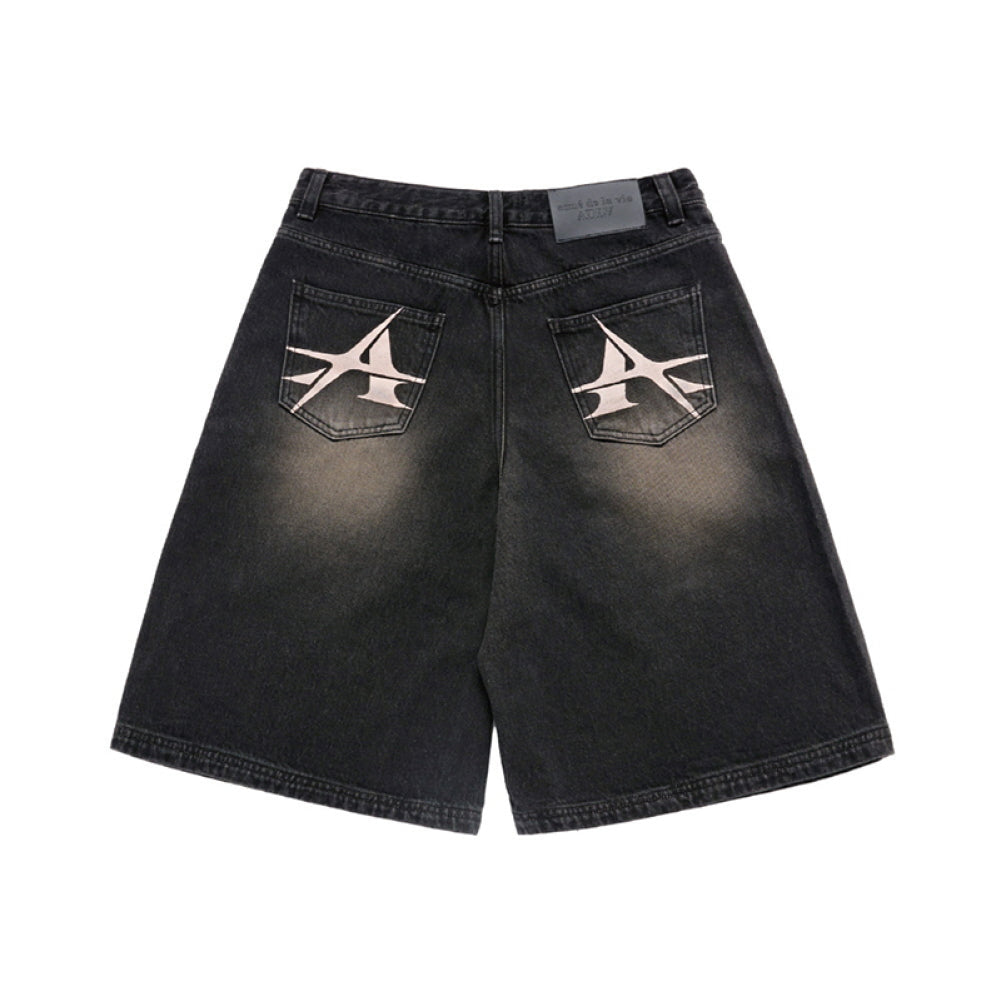 A sleek black denim short with ADLV’s point logo accent, offering a modern and minimal style suitable for any casual wardrobe.