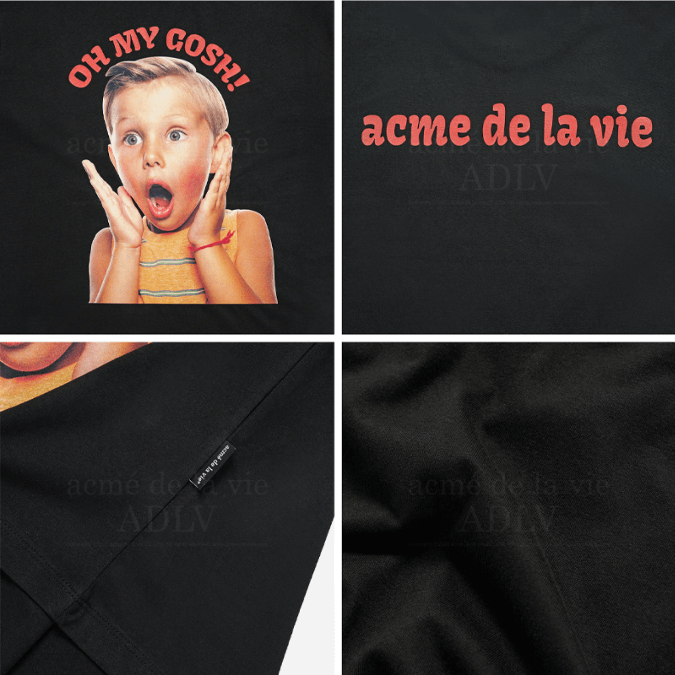 A bold and humorous statement tee from ADLV’s Baby Face collection. The Scream Boy Lettering Baby Face Short Sleeve T-shirt in black showcases a vivid front graphic of a surprised boy with the text “OH MY GOSH!” above, blending pop-culture fun with streetwear attitude. The back features the signature “acmé de la vie” logo in red, balancing the playful design with brand identity. Made from 100% premium cotton, it offers exceptional softness, breathability, and structure for all-day comfort.