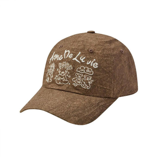 A vintage-inspired light brown tie-dye ballcap featuring playful graffiti graphics, blending retro tones with expressive street style.